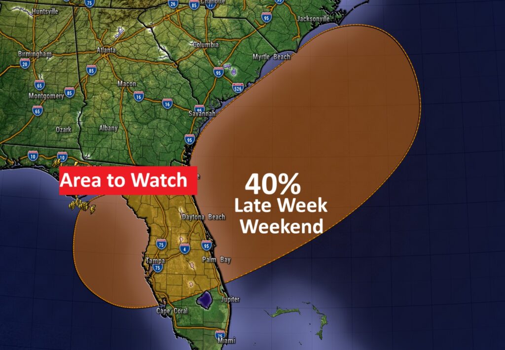 TROPICAL: NHC now says there’s a 40% chance of Tropical Development over the next few days from the Eastern Gulf, across Florida and into the Atlantic. There will be a stalled front. A sub-tropical or tropical depression could form late week or this weekend.