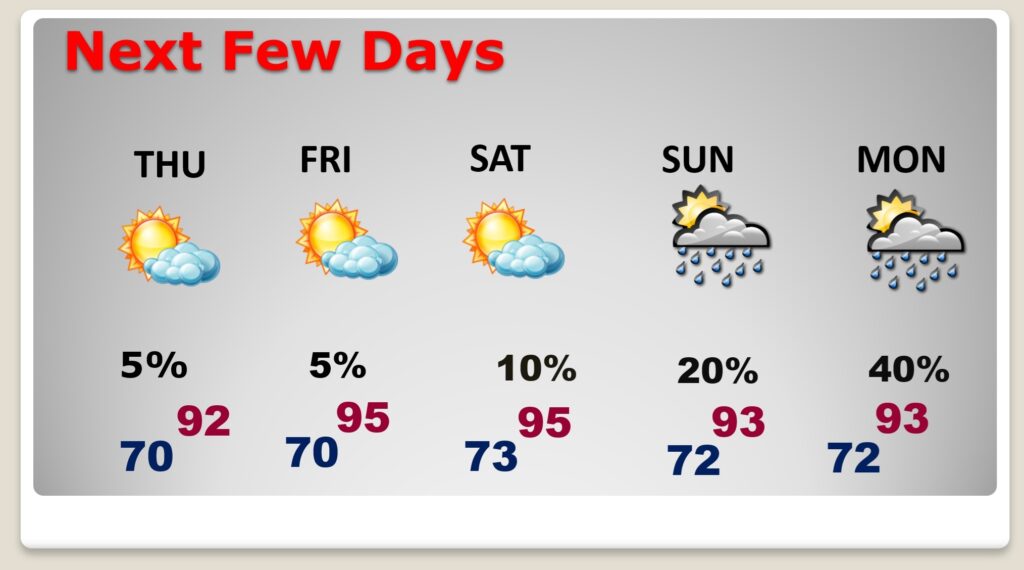 TODAY: Sun/Clouds. Hi 90. Widely scattered random showers and storms in the afternoon/evening. Low tonight 72.