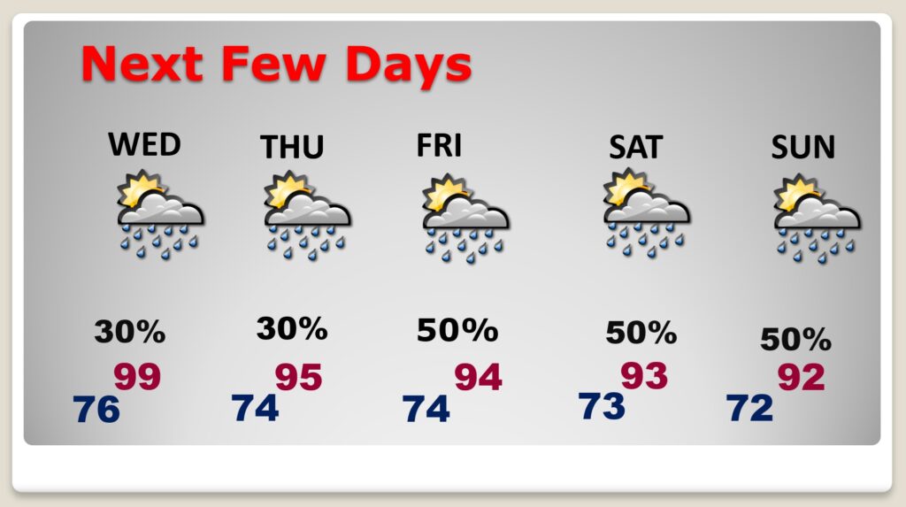 NEXT FEW DAYS: The Heat Advisory continues through at least Wednesday evening. The Heat index will reach the 105 Danger Range. Nighttime lows in the extremely humid low to mid 70’s. Scattered PM storms are back in the forecast starting Wednesday through the end of the week.