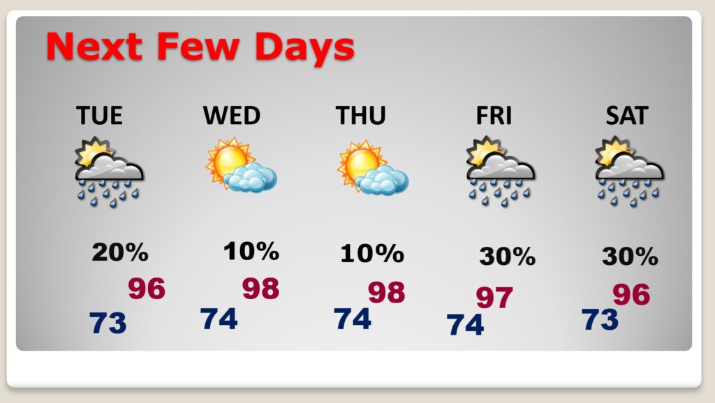 NEXT FEW DAYS: The heat index will be into triple digits. Storms will be few and far between, over the next few days especially in the afternoon and evening hours. Expect upper 90’s by mid-week. The Heat index will reach the 105 Danger Range. Nighttime lows in the extremely humid low to mid 70’s.