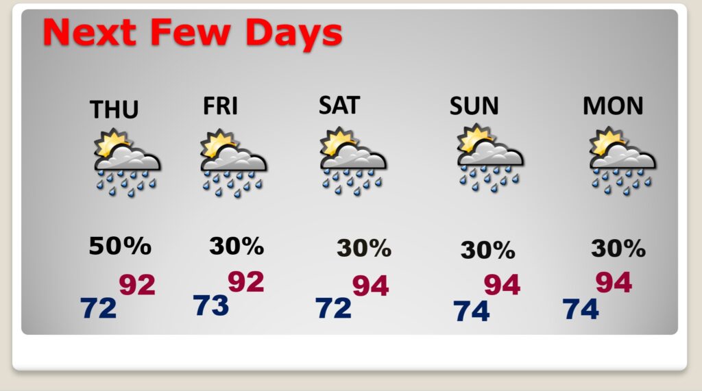 Good morning! There are some gradual, subtle weather changes in our future. There will still be random thunderstorms everyday. But, the trend will be for fewer storms on the radar. So, your probability of running into a heavy tropical downpour will be lower. The other side of the coin is this. Expect some hotter afternoon temperatures, especially by the end of the week and over the upcoming weekend. Unfortunately, that will most likely lead to heat indices into the 105+ danger range. The summer solstice is 9:42 PM Friday night, which means Saturday is the first full day of summer. Here’s my brief forecast discussion.