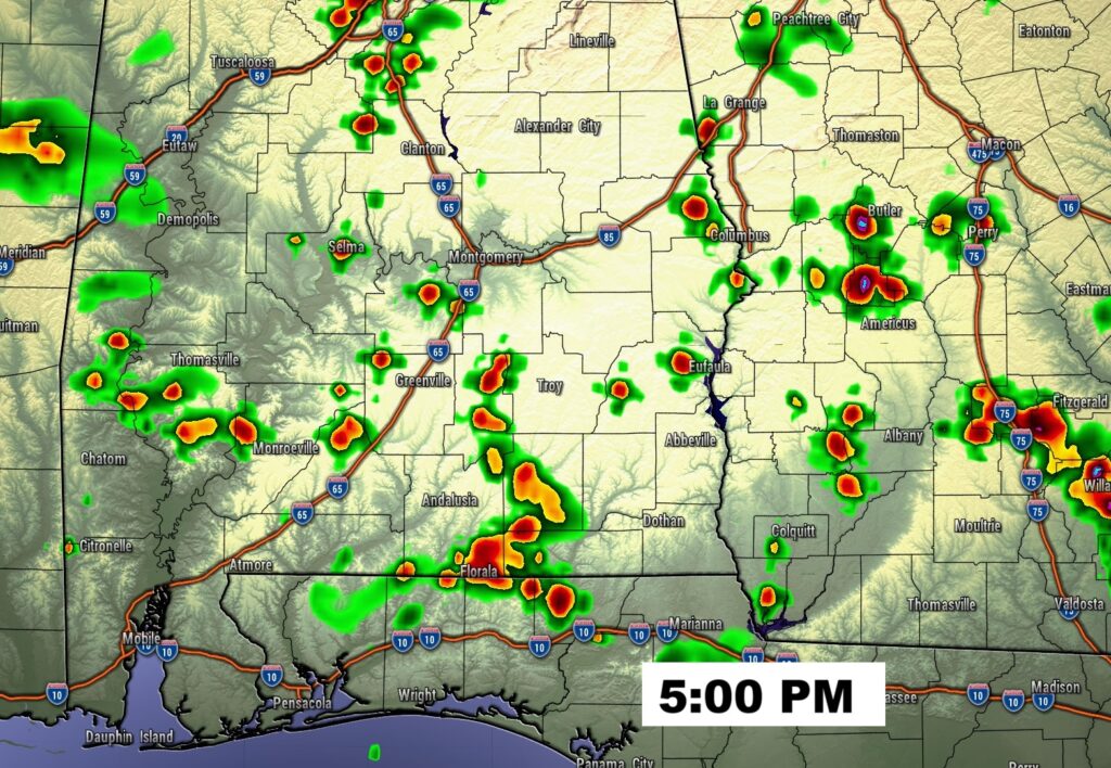 FUTURE RADAR: Pretty typical. Random scattered showers and storms, most numerous inn the late afternoon and through the evening hours, before fading overnight.