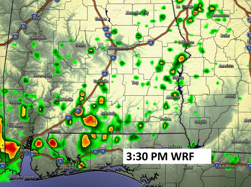 FUTURE RADAR:  Not as many storms expected on the radar today.  Most showers and storms from about US 80/I-85 southward, peaking late afternoon and into the early evening before fading out.