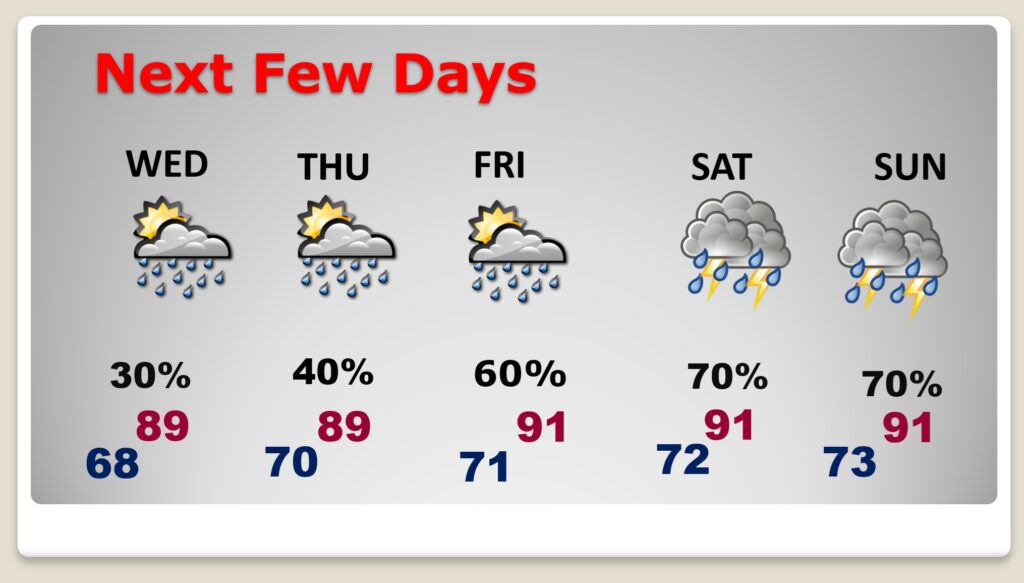 NEXT FEW DAYS:  Not much day to day change.  Random Showers and storms will be most numerous in the afternoon and evening hours.  The highest day to day rainfall probabilities will be highest Friday through Father’s Day Sunday.
