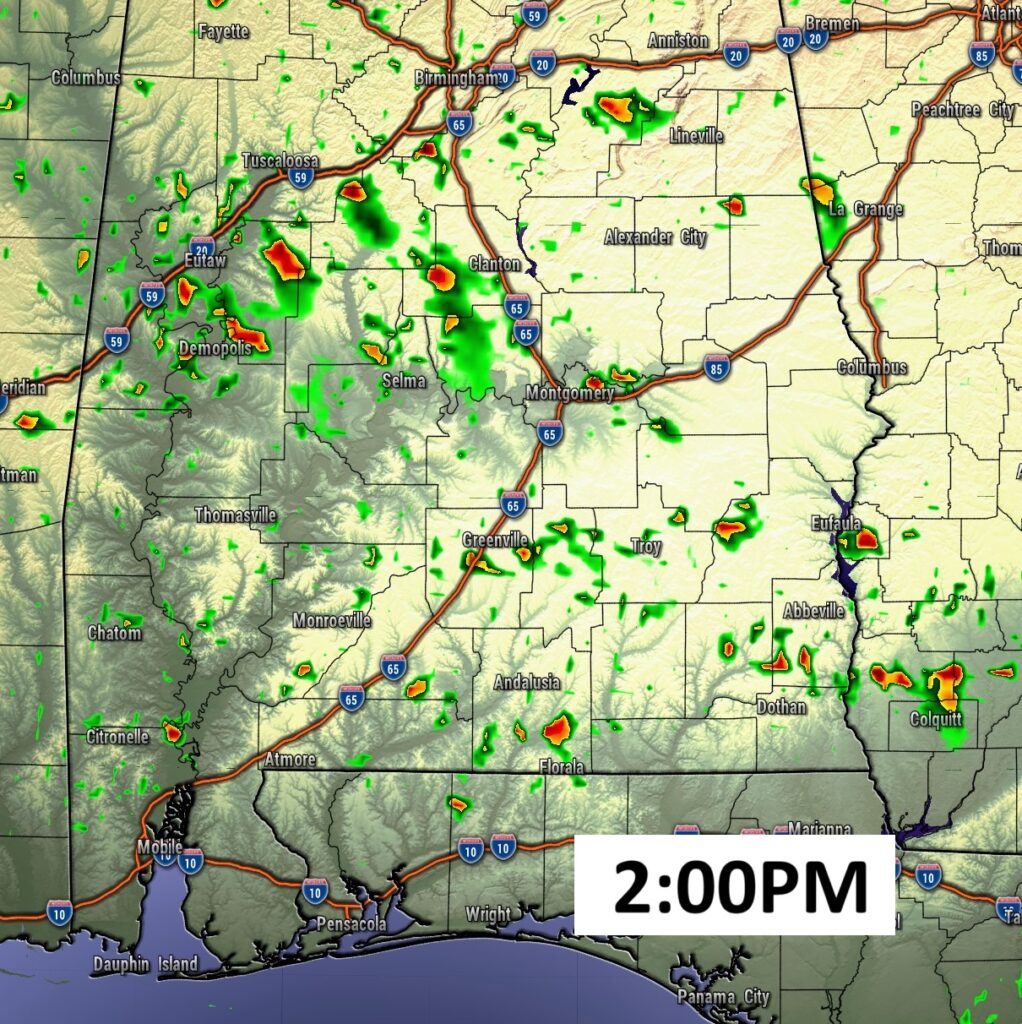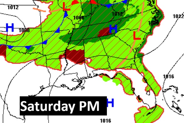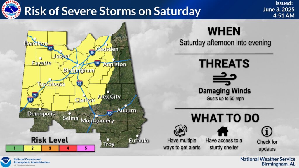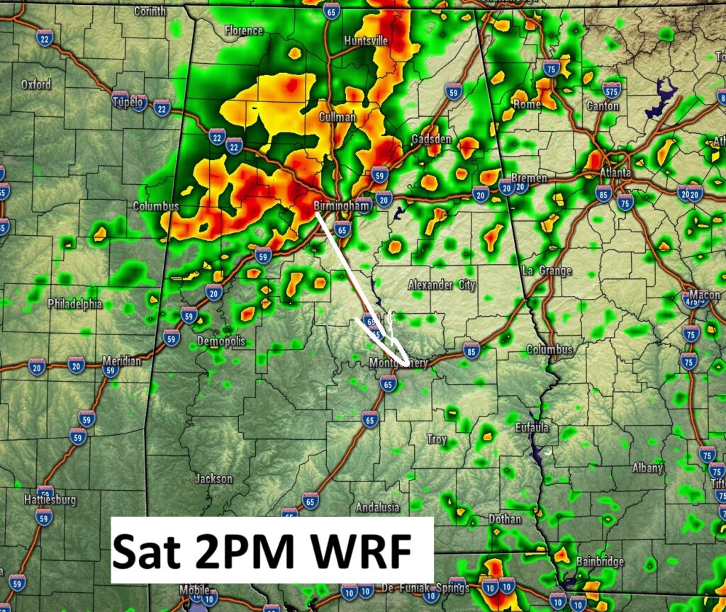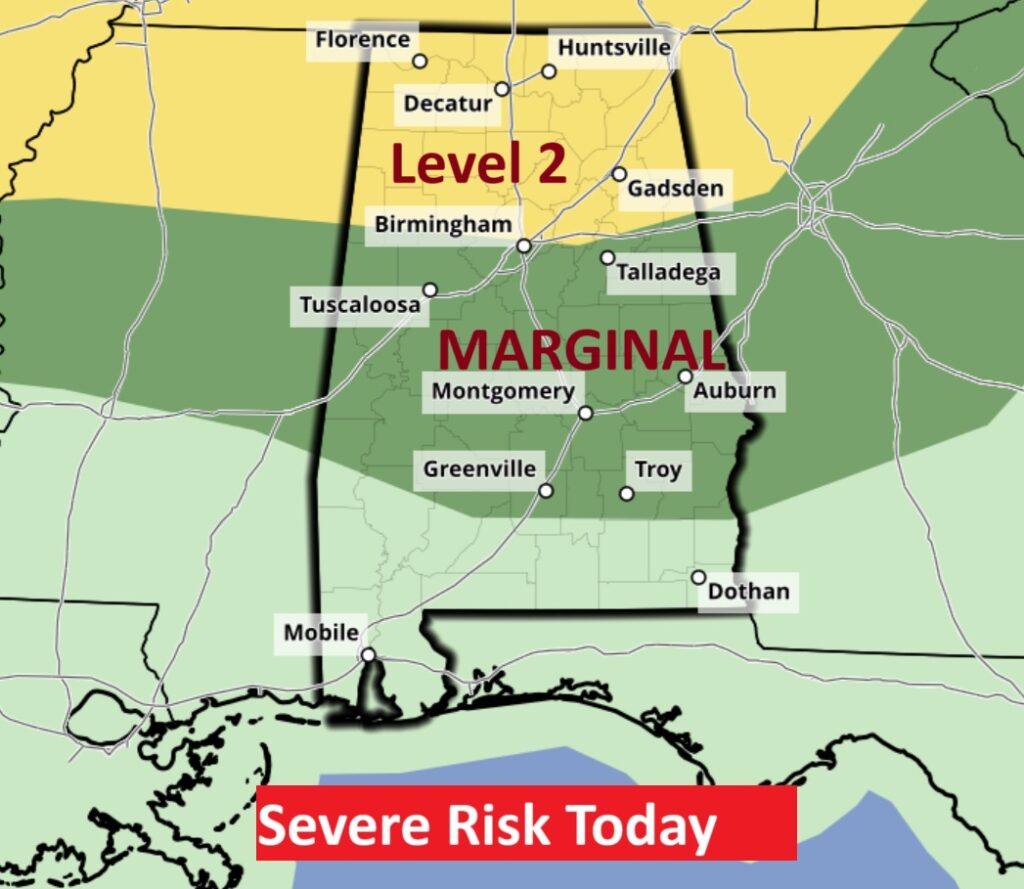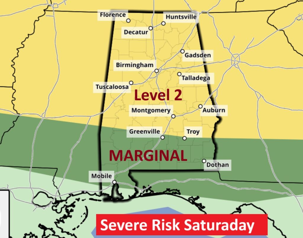 SPC has most of us in a Level 1 Marginal Risk today and Sunday. (and probably Monday) BUT, Saturday, a large extended area of Level 2 Risk (2 out of 5) covers much oif the state as far south as Troy/Greenville. SPC has also hinted on an upgrade to Level 3 for part of the state. Damaging straight-line wind gusts is the main risk. Our Weather App will keep you on top of the action.