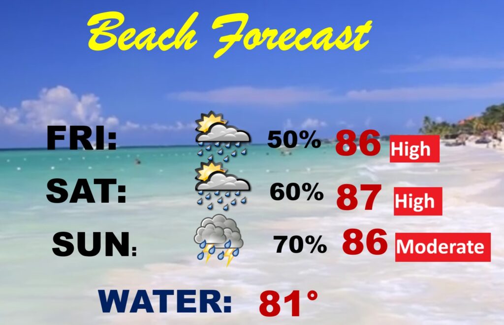 BEACH OUTLOOK: Be flexible with your plans. Numerous showers and storms will be roaming around each day, most numerous in the afternoon and evening. Gulf water temperature 81.