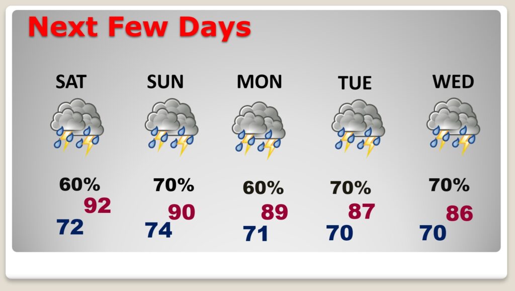 NEXT FEW DAYS: Not much day to day change. Random Showers and storms will be most numerous in the afternoon and evening hours. Some of the storms could be strong to severe especially on Saturday with a Level 2 Severe Risk. But even today and Monday there’s a Marginal Severe Risk. Damaging straight-line wind gusts is the main threat.