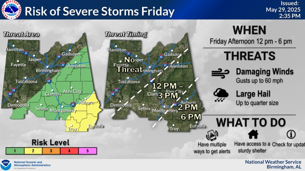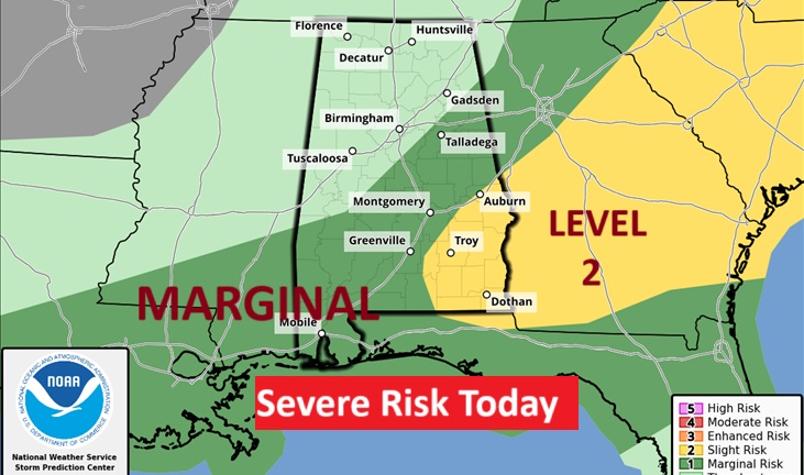 There is a Marginal Severe Risk from the Storm Prediction Center for many of us in central Alabama and a level 2 risk in Southeast Alabama. Damaging wind gusts is the main risk.