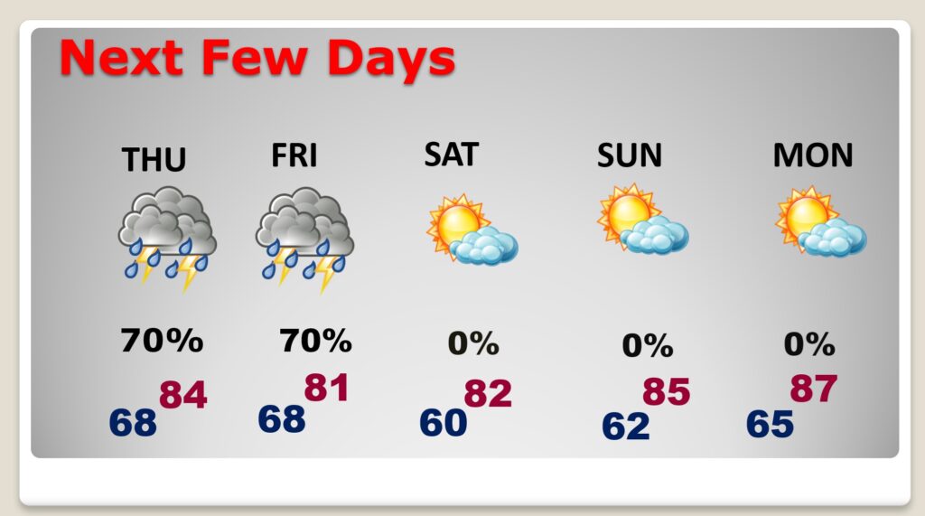 NEXT FEW DAYS: Random Scattered showers and thunderstorms will continue through Friday. Most numerous in the afternoon and evening hours. Some storms will be strong. Highs mostly in the 80’s Low at night near 70. Cold Front will sweep through the state by Friday. That will set the stage for nice weather the weekend.