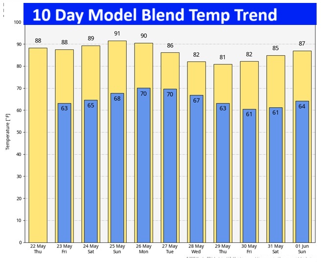 10 Day model blend temperature trend. Normal 87/63.