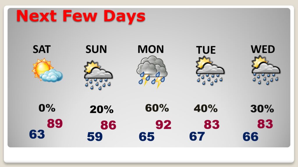 The weather news for the next few days is good. Today through Friday will feature lot of sun with low humidity days and pleasantly cool nights. The next risk of widely scattered showers and storms arrives Saturday and Sunday. A few stronger storms are possible. Memorial day could be rather wet and stormy by afternoon. And, more scattered showers and storms will stick around Tuesday and Wednesday. Here’s my brief video forecast discussion.