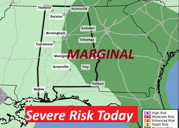 Once again, SPC is highlighting a Level 1, Marginal Severe Risk for the eastern counties of Alabama.