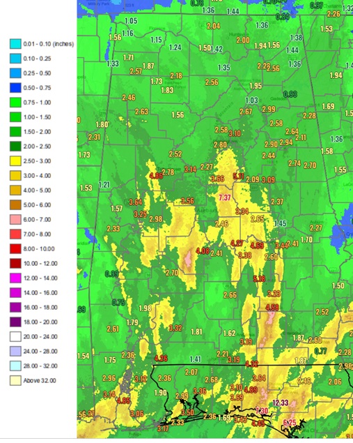 Here’s a 72 Hour Rainfall accumulation from 7am Friday morning through 7am this morning. 3 to 5 inches fell on average in many places, with the highest total on our scope in Chilton County at over 7 inches.