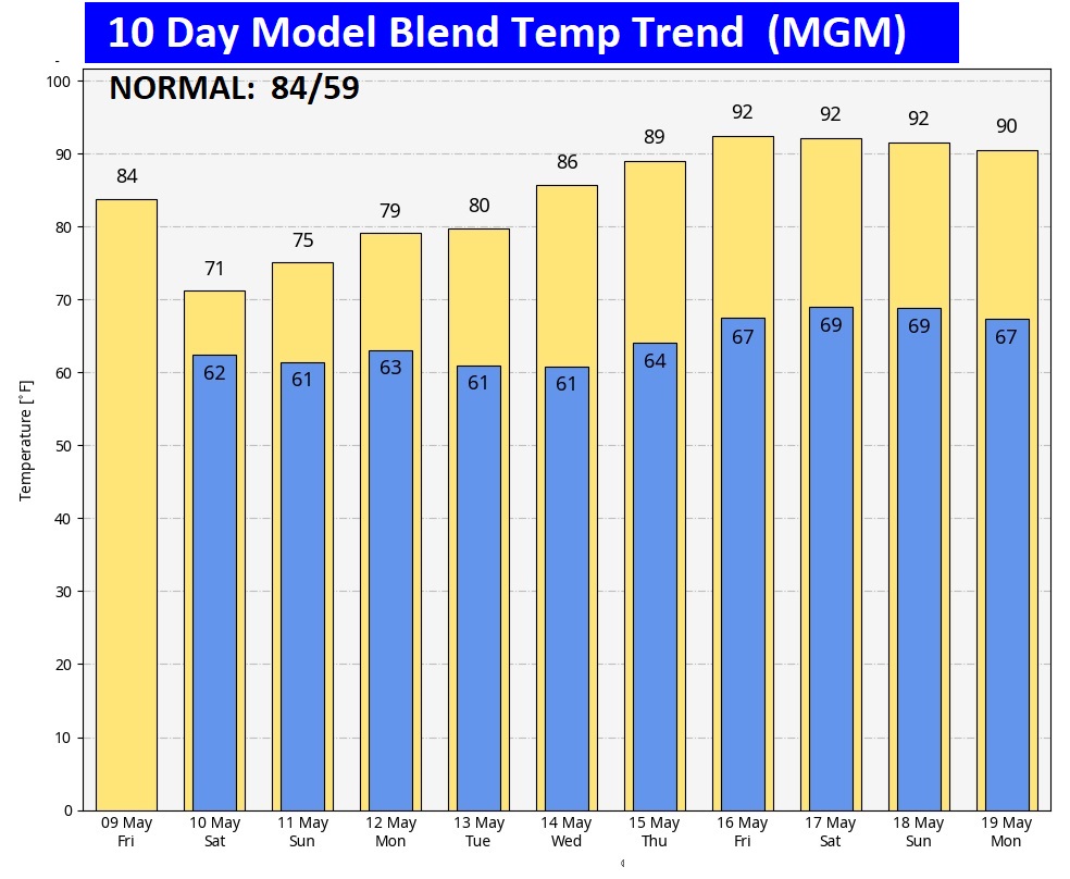 Here’s the 10 day model blend temperature trend. Some of the hottest temperatures begin by mid May. 90+.