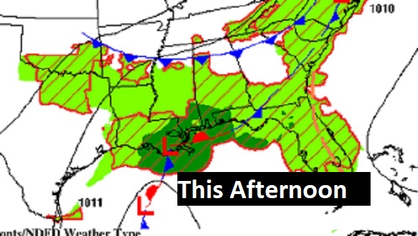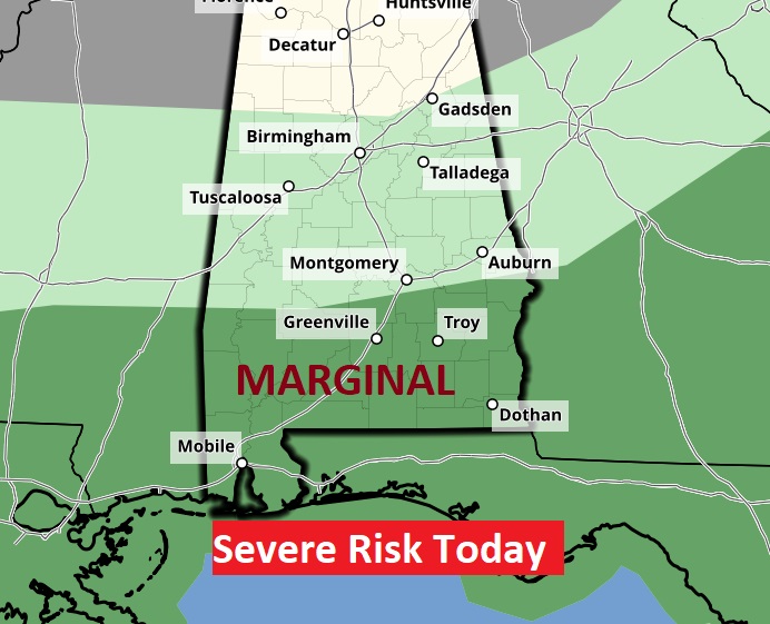 The Storm Prediction Center has a Marginal Risk for all of south Alabama, generally south of a Auburn and Selma line. The main risk is damaging wind gusts. Large hail is also possible.