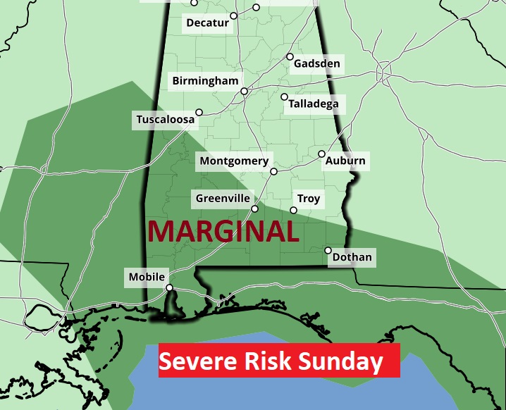 SPC also has a Level 1 Marginal Risk for much of southwest and south Alabama on Sunday.