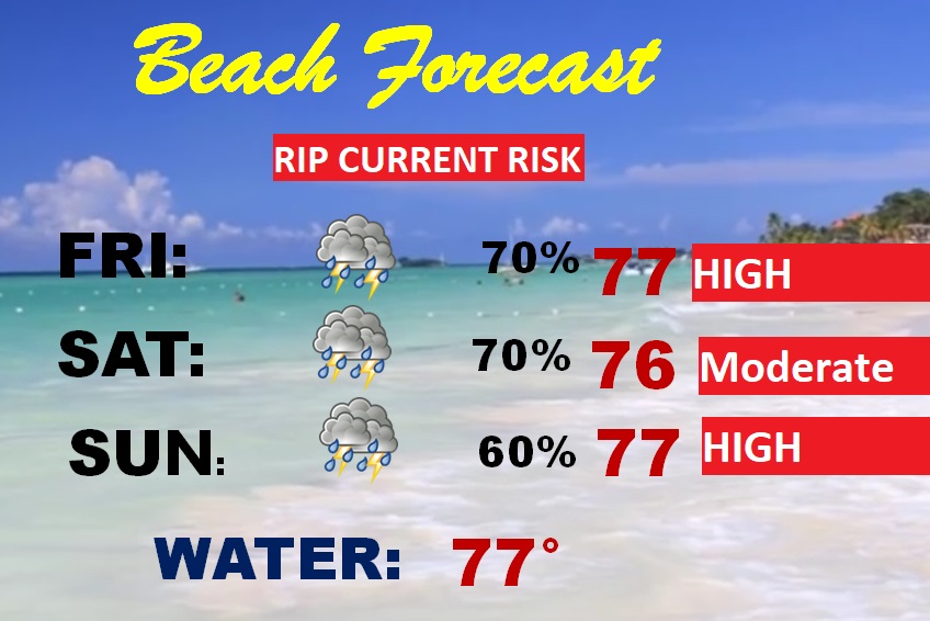 BEACH OUTLOOK: Scattered showers and thunderstorms will be around from time to time over the Mother’s Day weekend. There will also be several dry hours. Highs in the upper 70’s. Gulf water temperature 77. High Rip Current risk especially from about Destin eastward.