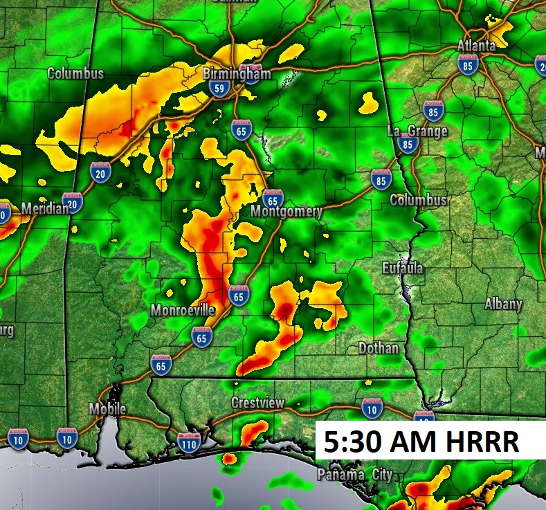 Future radar clearly shows that the highest probability of concentrated showers and storms wilk be this evening and overnight tonight. Some storms could be strong especially in South Alabama.