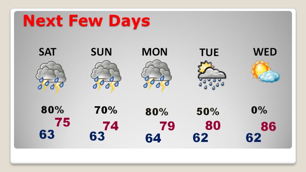 NEXT FEW DAYS: Scattered showers and thunderstorms will be around each of the next several day through early next weekend. It’s not going to rain all the time. There will be several hours of dry weather. Highs will be held down to the mid 70’s by clouds and showers over the weekend. Lows at night in the 60’s.Rain probabilities will be in the 70 to 80% range Saturday through Monday.