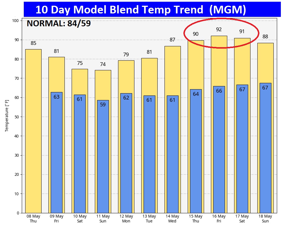 Here’s the 10 day model blend temperature trend. Highs will be held down to the mid 70’s by clouds and showers over the weekend. But check out those numbers for May15th and beyond.