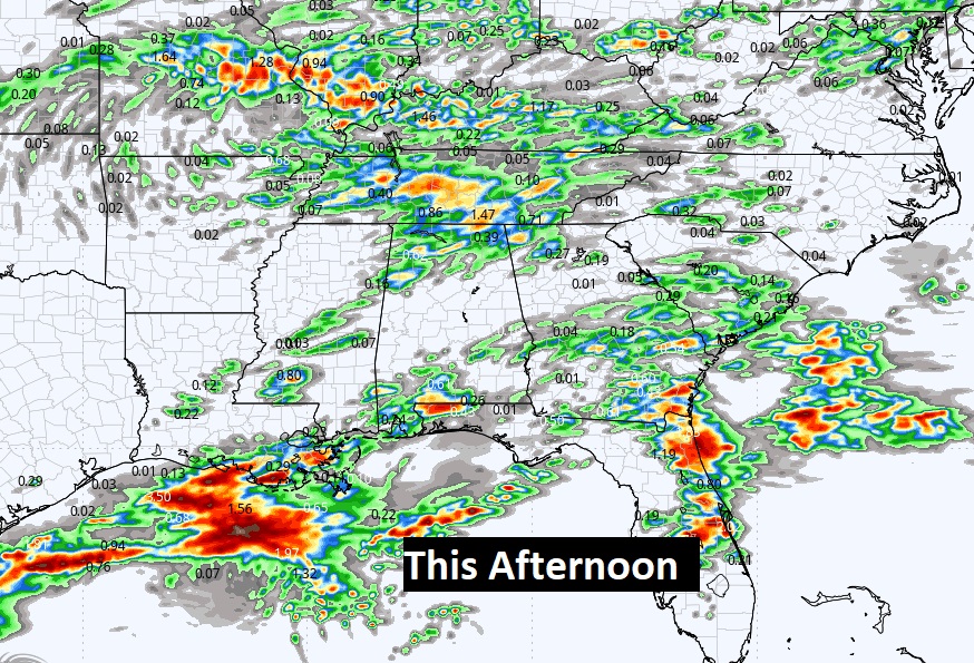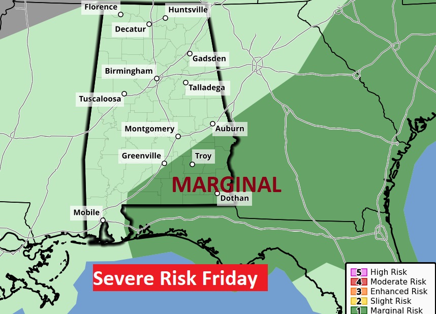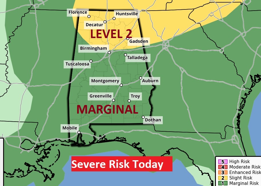 The Storm Prediction Center has a Marginal Risk for all of us today and a Level 2 Risk for north Alabama. Because of cold air aloft, some of the storms could produce large hail, especially in north Alabama. The main risk is damaging wind gusts. Tomorrow the Severe Risk shifts to southeast Alabama.