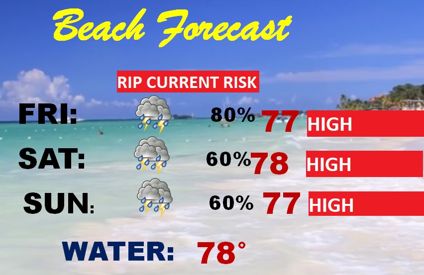 BEACH OUTLOOK: Scattered showers and thunderstorms will be around from time to time over the Mother’s Day weekend. There will also be several dry hours. Highs in the upper 70’s. Gulf water temperature 78. High Rip Current risk especially from about Destin eastward.