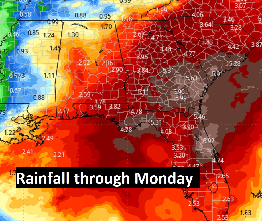 Parts of the Southeast US will see drenching rainfall totals over the next 6 days.