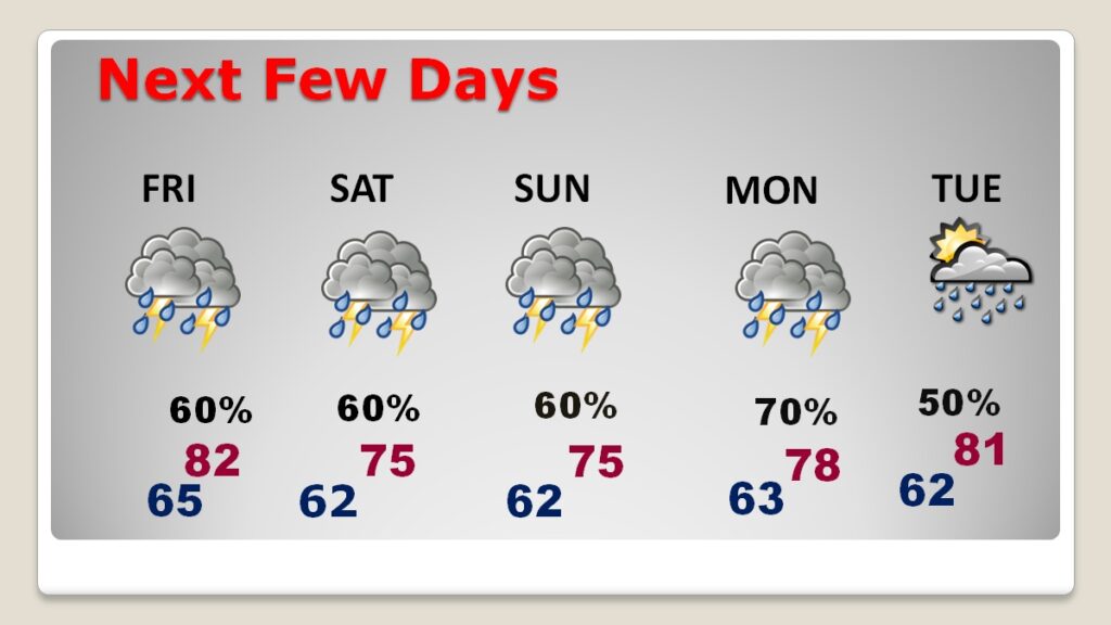 NEXT FEW DAYS: Scattered showers and thunderstorms will be around each of the next several day through early next weekend. It’s not going to rain all the time. There will be several hours of dry weather. Highs will be held down to the mid 70’s by clouds and showers over the weekend. Lows at night in the 60’s. Rain probabilities will be in the 60% range each day through the weekend, and a little higher by Monday.