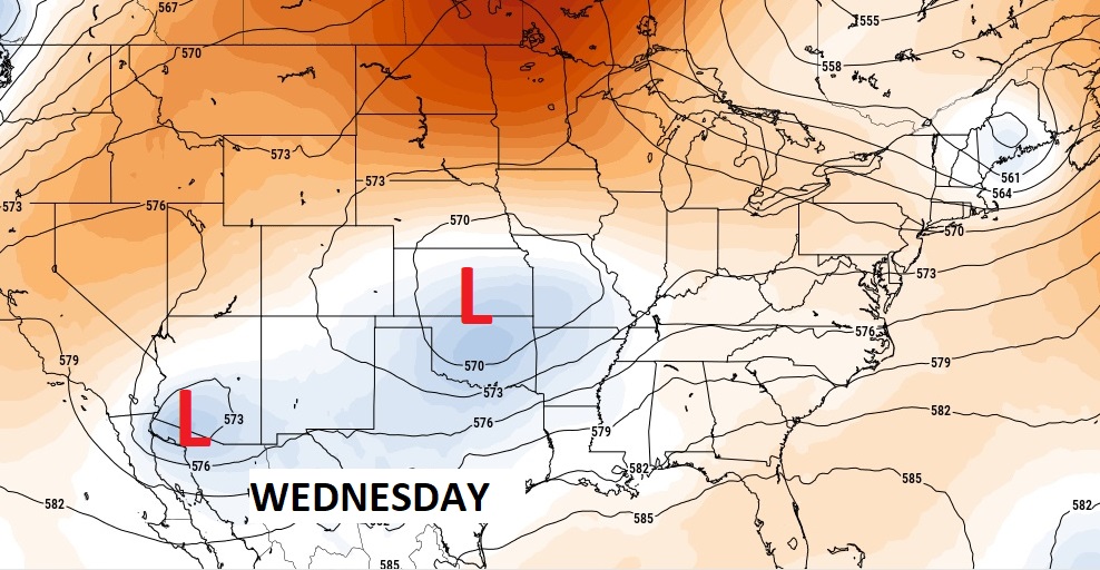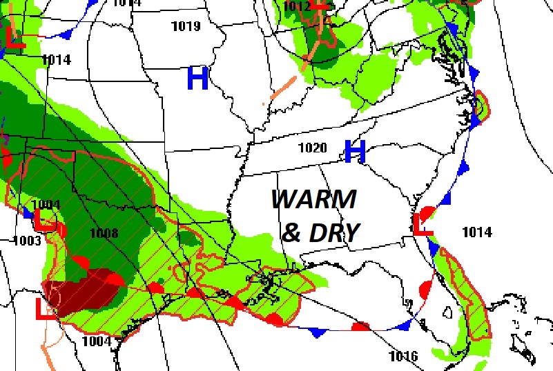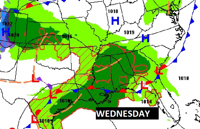 NEXT FEW DAYS: Get ready for a parade of storm systems….one after another after another, across the Gulf south each day through Sunday. It’s not going to rain all the time, but the risk of showers and storms will be in the forecast each day Wednesday through Sunday. Highs most days will be in the 70’s. Lows in the 60’s.