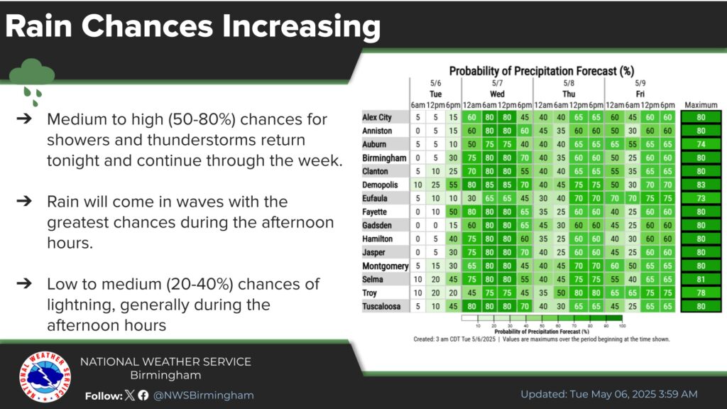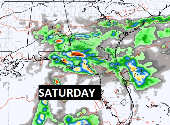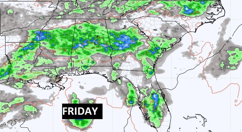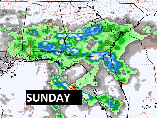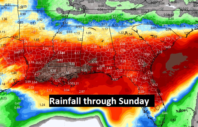 Look at this graphic. Here’s the expected rainfall through Sunday. It’s a very wet forecast. This is the model blend average. Looks like parts of south Alabama could see 4 to 6 inches.