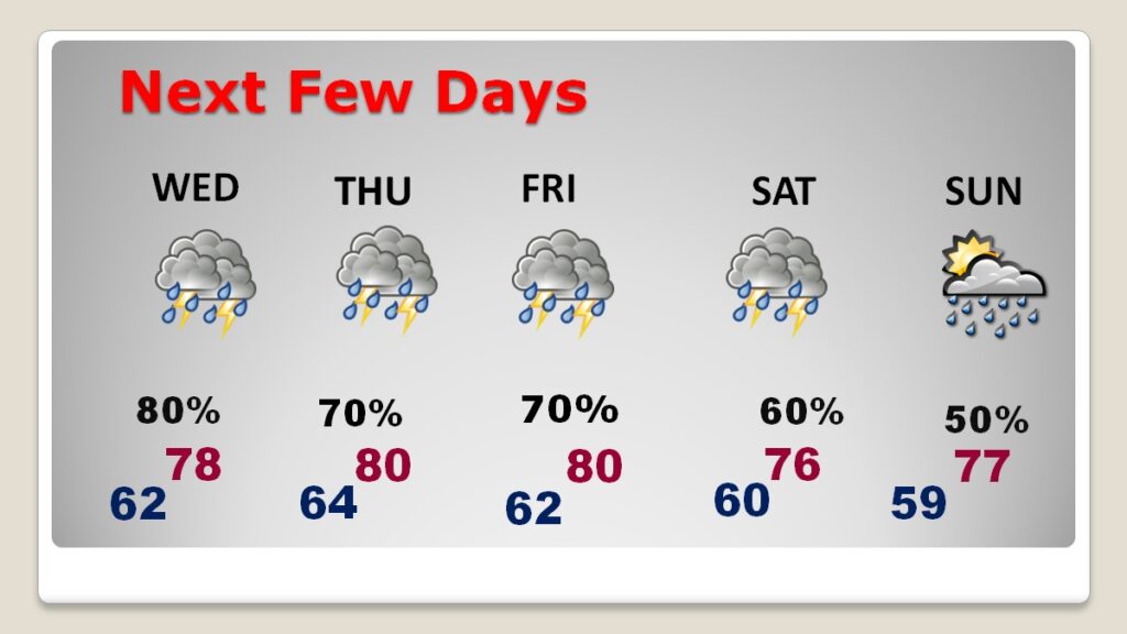 Good Morning! Enjoy today, because big changes are on the way. Today looks like a nice day. Very comfortable with low humidity. Get ready for a very active multi-day active weather pattern. We’re dry through the evening hours tonight. A series of storm systems will produce waves of rain and thunderstorms beginning in the overnight hours, and periods of showers and storms through Sunday. Rainfall amounts could be significant. Here is my brief video forecast discussion.