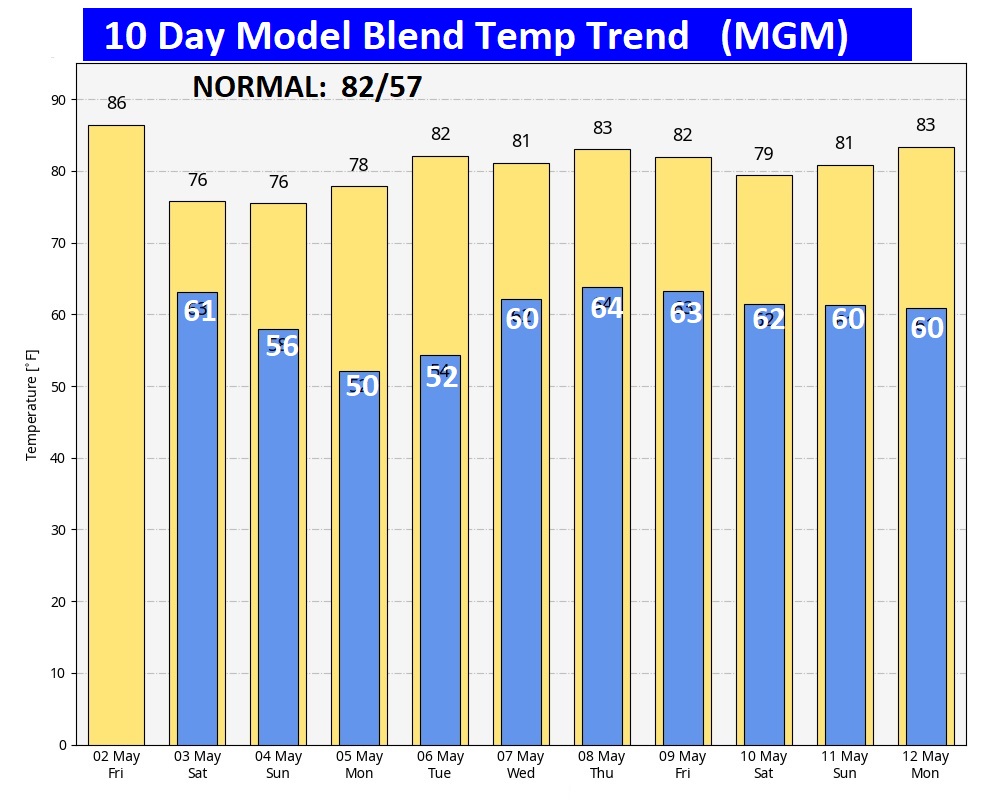 Here’s the 10 day model blend temperature trend. Look at some of those very chilly mornings. Expect slow warming next week. (Normal 83/57)