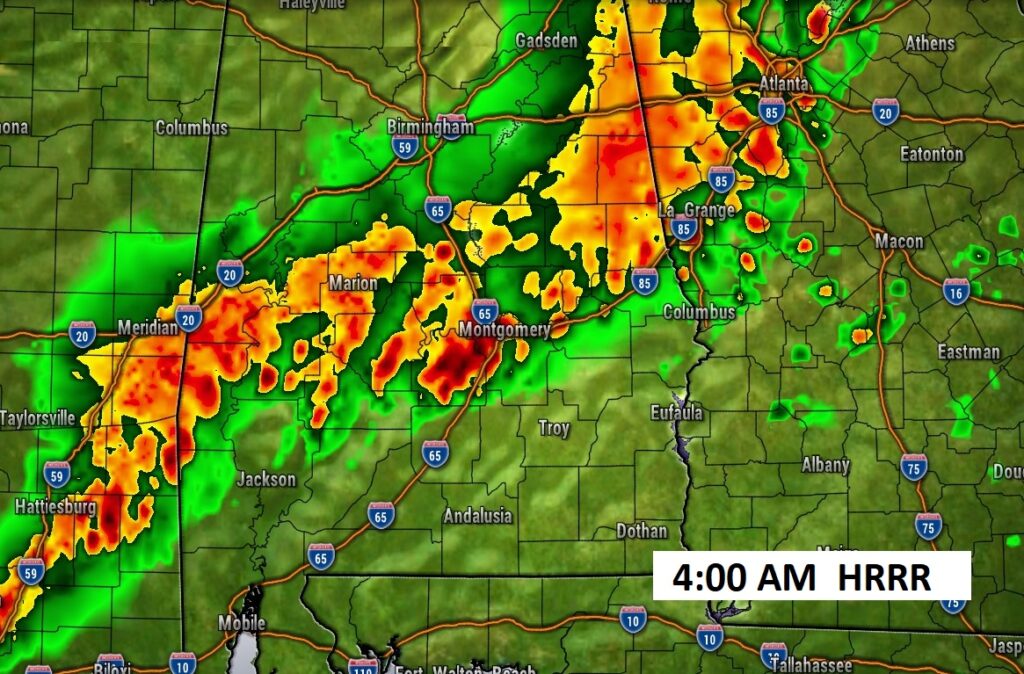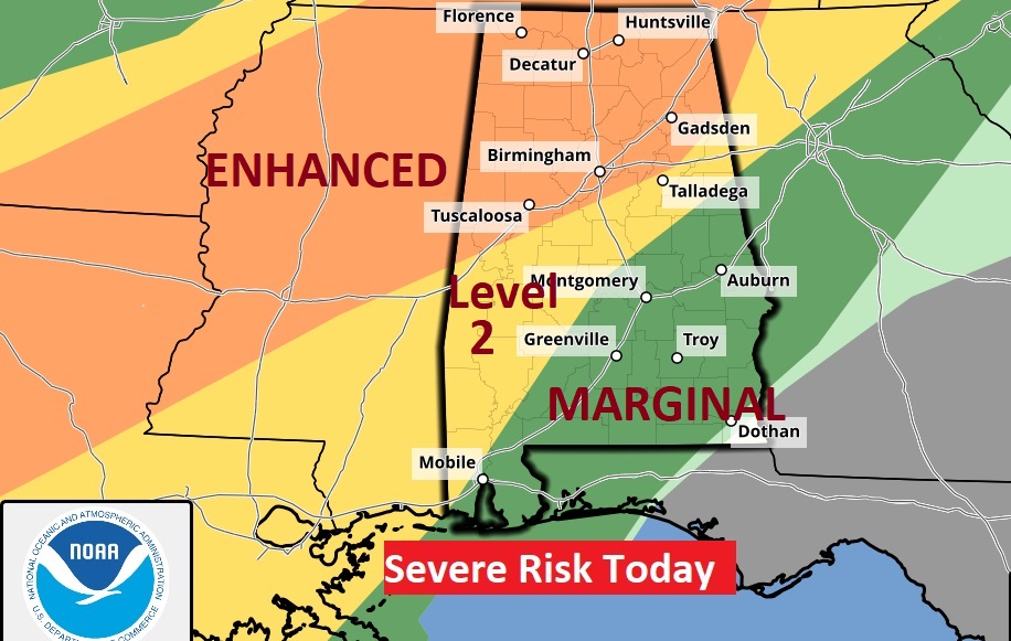 The Storm Prediction Center has all of the state in a Severe Risk, from a Level 1 risk across the southeastern counties to a Level 3 Enhanced Risk across northwest Alabama. Damaging wind gusts are the main threat.