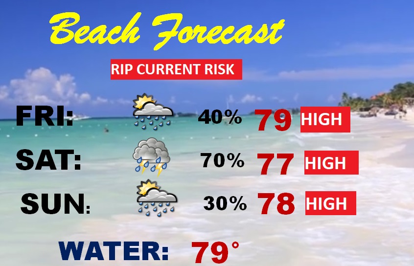 Risk of scattered showers and storms could affect your Beach plans especially Saturday. High rip current risk especially from Destin eastward. Gulf water temperature now at 79.