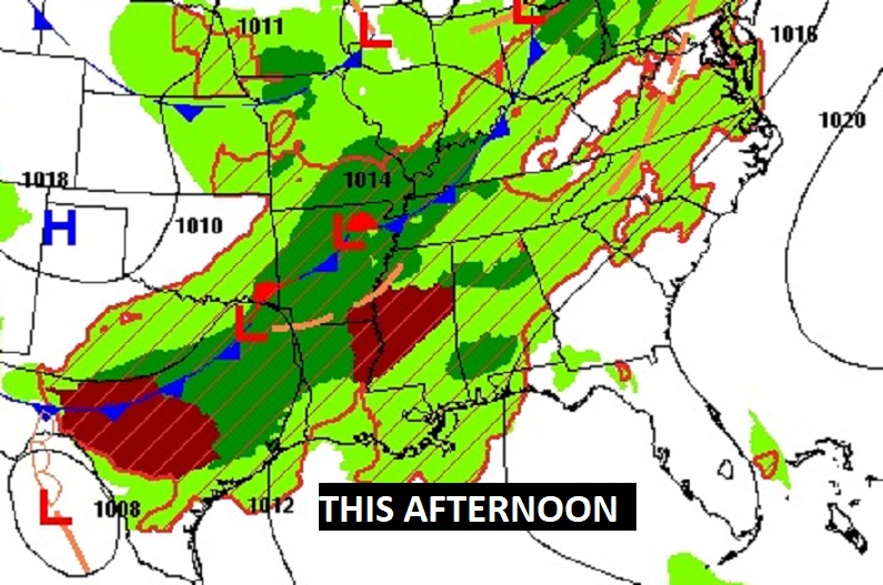 TODAY: Patchy dense fog in spots this morning. Partial sunshine. Very warm again. High 88. Scattered showers and storms by this afternoon. Showers and storms will become more numerous tonight, especially late. Some potentially strong/severe Low tonight mid 60’s.