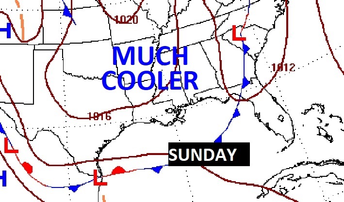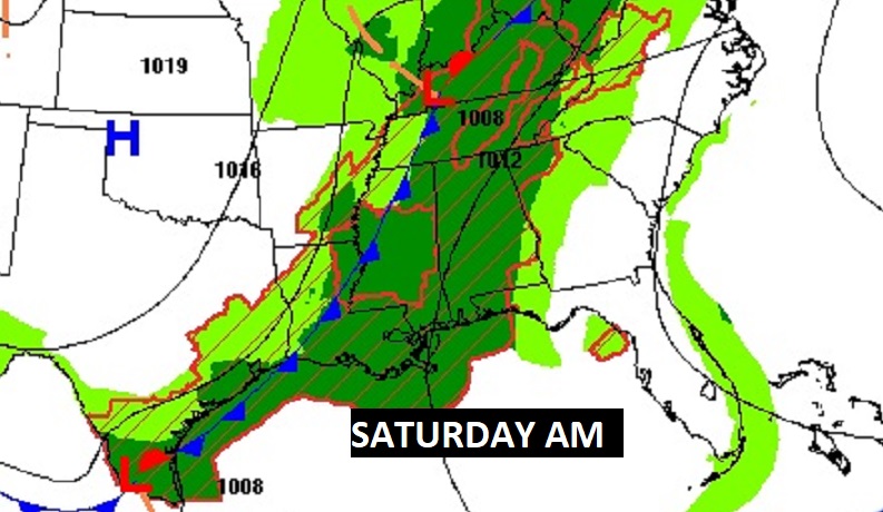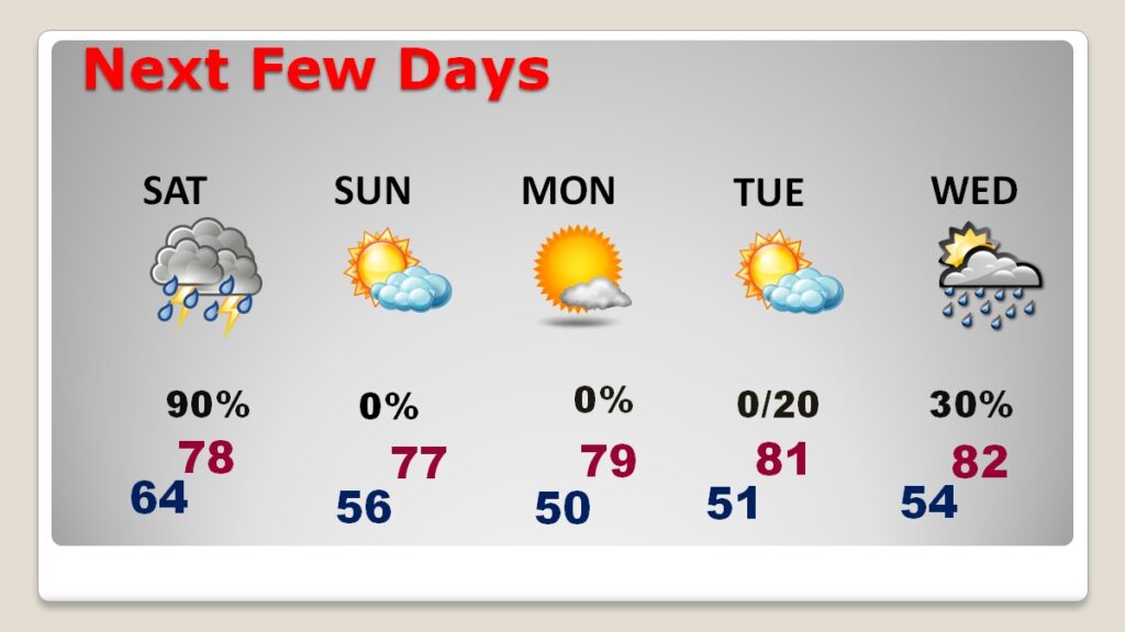 NEXT FEW DAYS: The slow moving cold front approaching will bring some much needed rain to our state. Showers and storms will be quite numerous Saturday. A few stronger storms are possible. Marginal Severe Risk. Much cooler air is also on the way. Highs will be in the 70’s Saturday through Monday. Chilly nights are on the way. The coolest mornings will be Monday and Tuesday with lows in the low 50’s or even near 50 at dawn.Sunshine will dominate Sunday through Tuesday.