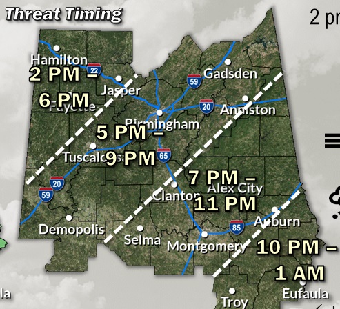 The Severe Weather timing map confirms the fact that most of us will see the strongest threat late tonight.