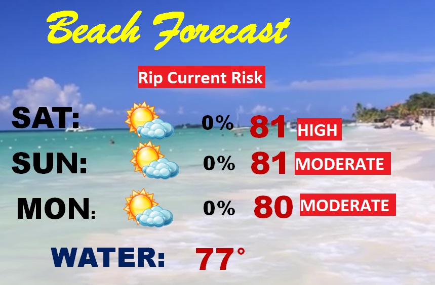 BEACH OUTLOOK: Nice forecast. In fact, a great forecast this weekend. Unfortunately, there is a high rip current risk especially from Destin to about Panama City today. Moderate elsewhere. The Gulf Water temperature has warmed to 77.
