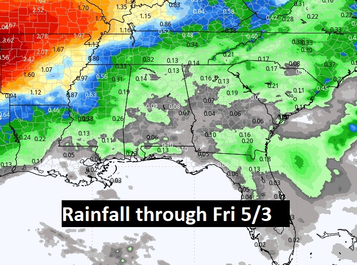 Here’s the expected rainfall for the next 7 days. Not much rain at all. The Montgomery Airport has not has measurable rain in 15 days.
