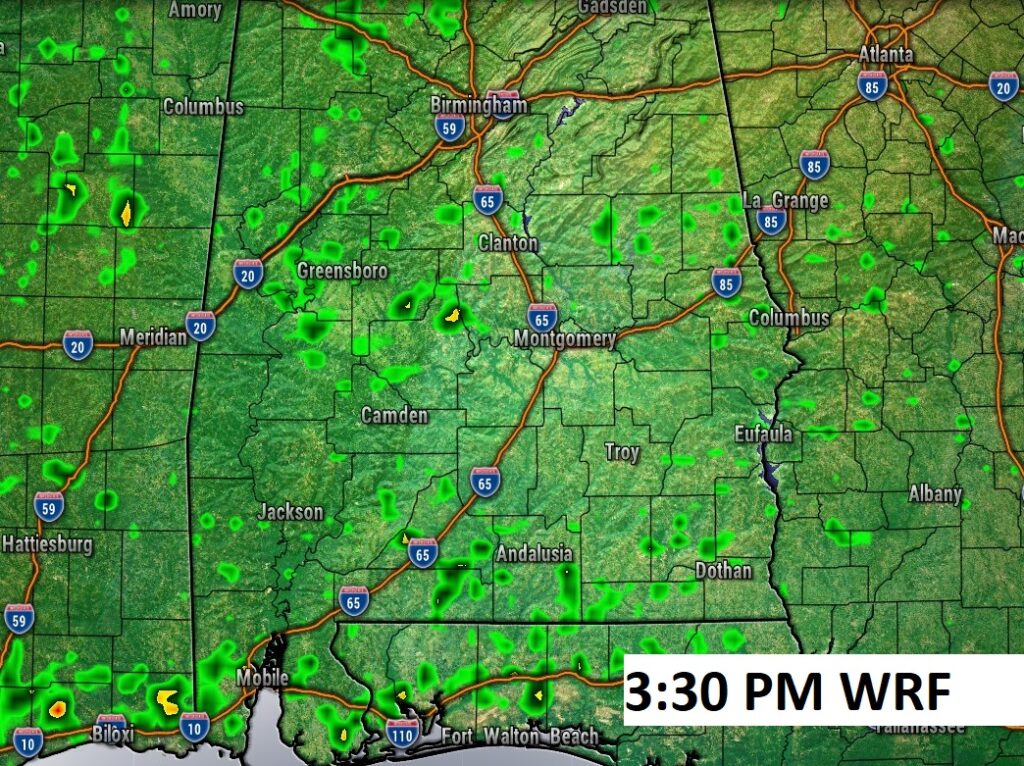 Future Radar: Rain chances are not zero, but very small, indeed. Under 20%. Here’s an example of hi-res future radar late this afternoon.