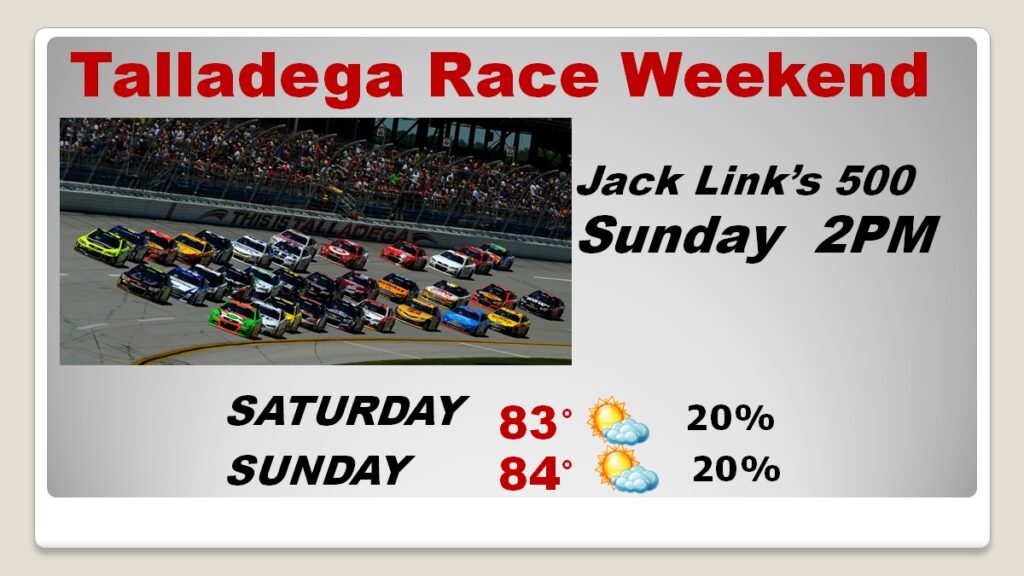 TALLADEGA RACE WEEKEND: It’s a pretty routine Talladega Race Weekend forecast with partly cloudy skies today and Sunday. Morning lows in the upper 50’s. Afternoon Highs in the low to mid 80’s. Afternoon rain chance 20% both days.