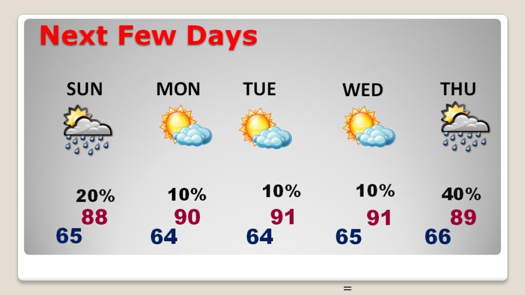 NEXT FEW DAYS: Little day to day change. Spotty random showers/storms are possible Sunday, with the probability relatively small at any location. By Monday, through the end of the month on Wednesday, highs are likely to reach 90 or above.