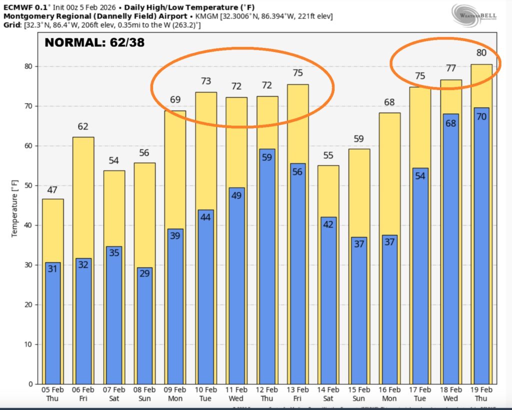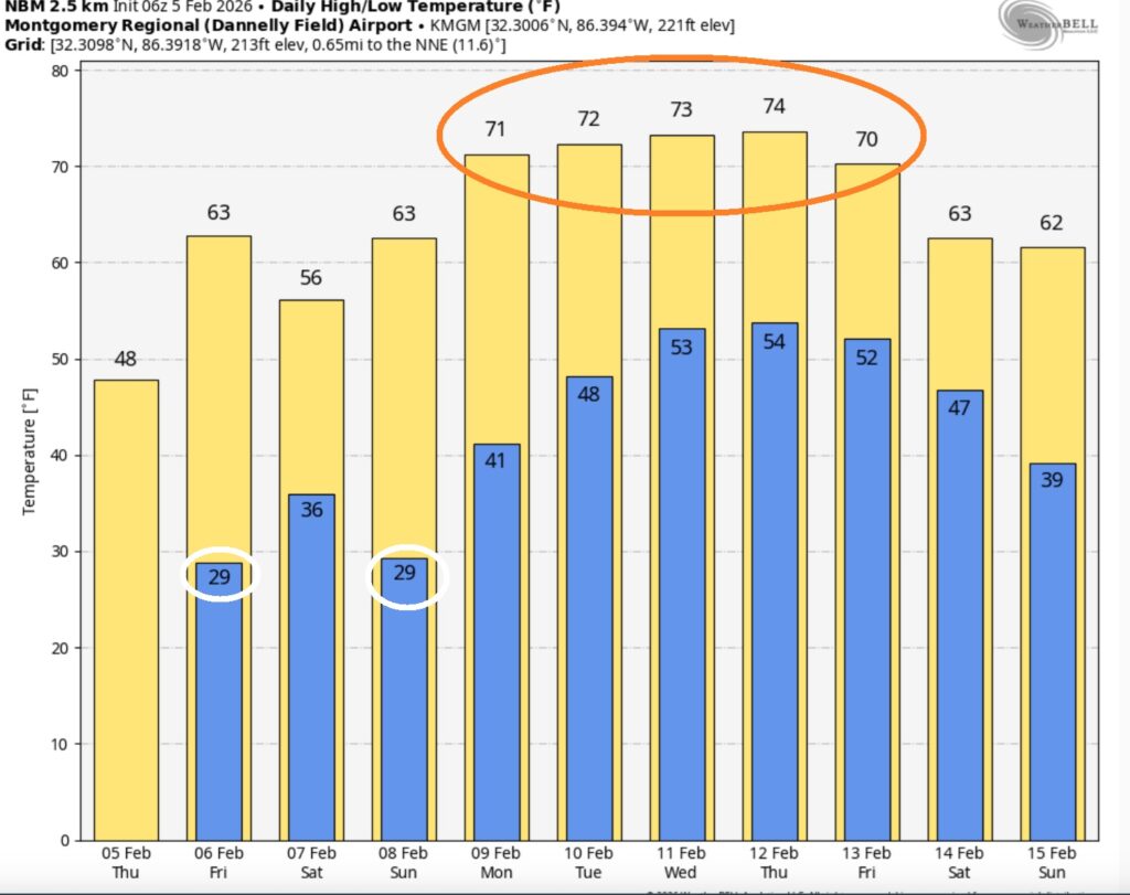 NEXT FEW DAYS: There is a major temperature re-bound in our future. Highs 60+ begins Friday. We’ll be well into the 60’s Saturday and Sunday. Perhaps 70+ by Monday. A February thaw is in our future.