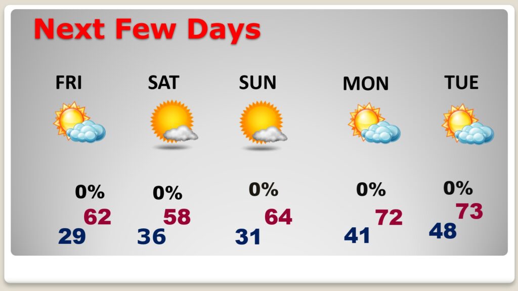 Good Morning! Today will be sunny, but chilly – with highs only in the 40’s. Another freeze is likely tonight. This will be a rather brief temperature set-back. There is a very nice weekend in our future. And, a big temperature rebound is in the cards for next week. Highs will reach the lower 60’s Friday. The weekend will be sunny, and only a little below normal. It should be a great weekend. Next week, several days could be 70 or above. It appears that the Arctic Floodgates will close for several days. Here’s my brief video forecast discussion.