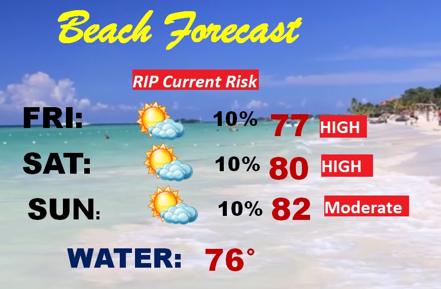 BEACH OUTLOOK: It’s a great forecast and it looks dry. Warm and nice. Unfortunately a high rip current risk continues, especially from Destin to about Panama City. Moderate elsewhere. The Gulf Water temperature has warmed to 76.