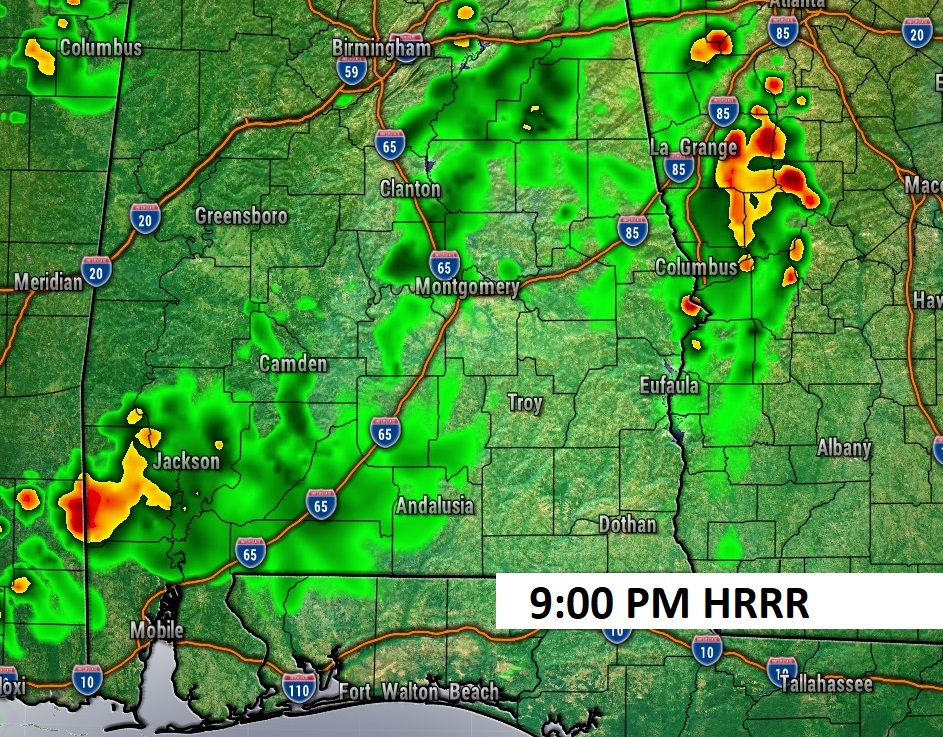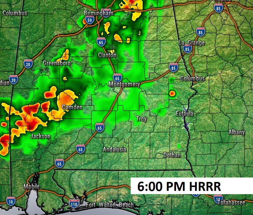 Future Radar favors this evening for the best chance of random showers and storms. Good luck. It has now been 14 days since the last measurable rain in Montgomery and MGM.