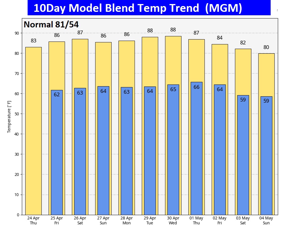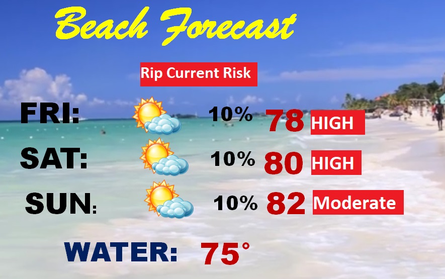BEACH OUTLOOK: It’s a great weekend forecast down at the beaches, from Gulf Shores to Panama City. Comfortable and nice. Unfortunately a high rip current risk, especially from Destin to about Panama City. Moderate elsewhere. The Gulf Water temperature has warmed to 75.