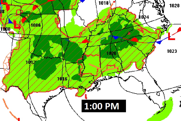 A couple of Future radar snapshots. Not every town will get wet. Feast or famine again. Random showers and storms will be most prominent in the afternoon and evening.
