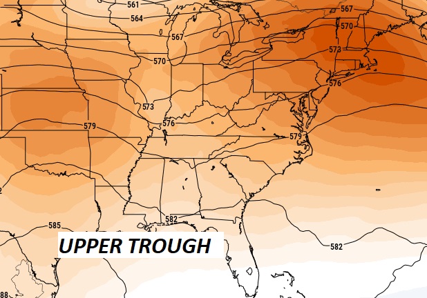 In the upper atmosphere (500MB), a trough of low pressure will tend to keep the atmosphere moist, unstable for the next few days, conducive for a few stronger storms with heavy downpours and gusty winds, in some cases.