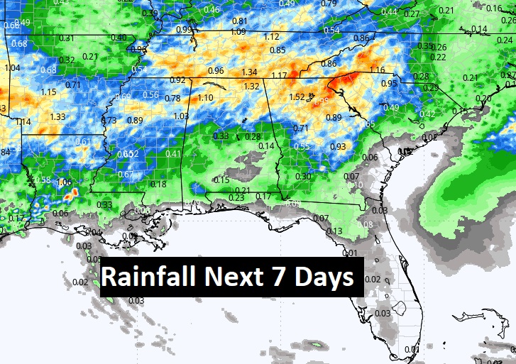 Here’s the expected rainfall for the next 7 days. Not much for much of central and south Alabama. The better concentration will be in the northern counties.